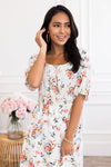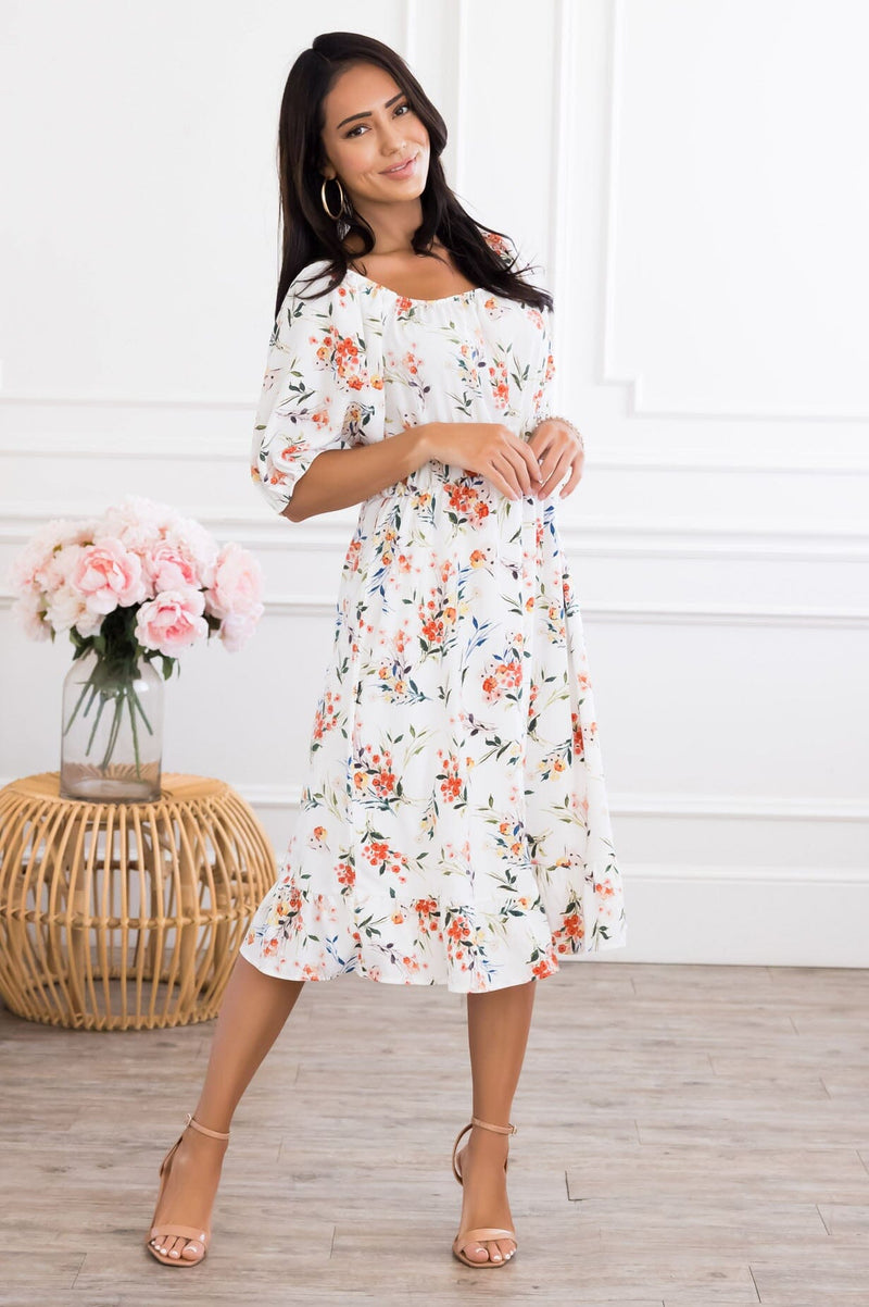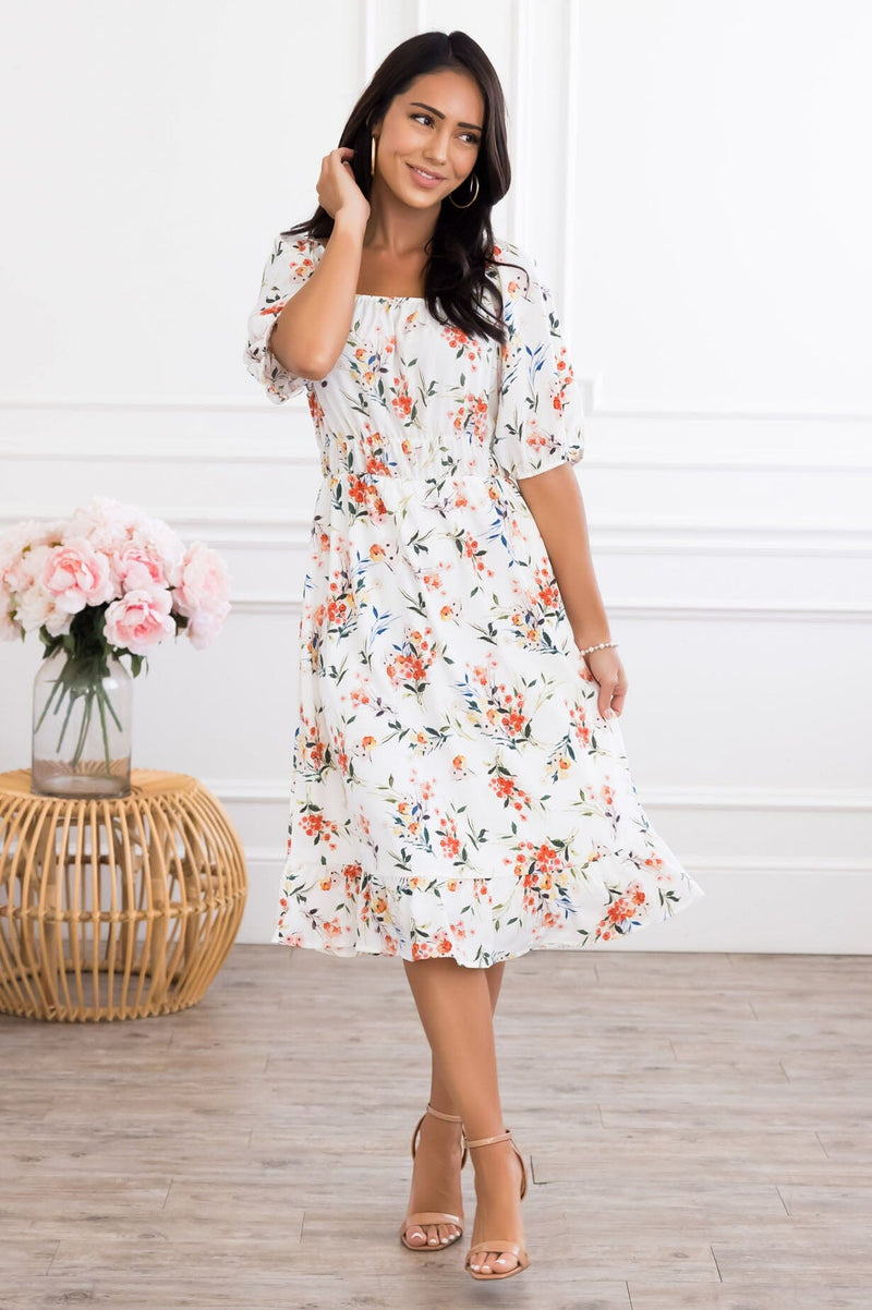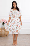 The Kiki is the sweetest little floral we have ever seen! We are so in love with the fit and style of this dress! Features include half length puff sleeves, round modest neckline, banded elastic waistline and the perfect length ruffle hem skirt!