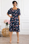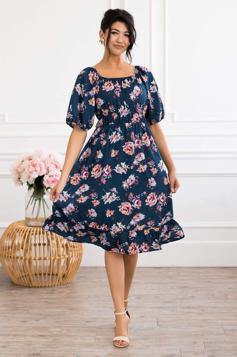 The Kiki is the sweetest little floral we have ever seen! We are so in love with the fit and style of this dress! Features include half length puff sleeves, round modest neckline, banded elastic waistline and the perfect length ruffle hem skirt!