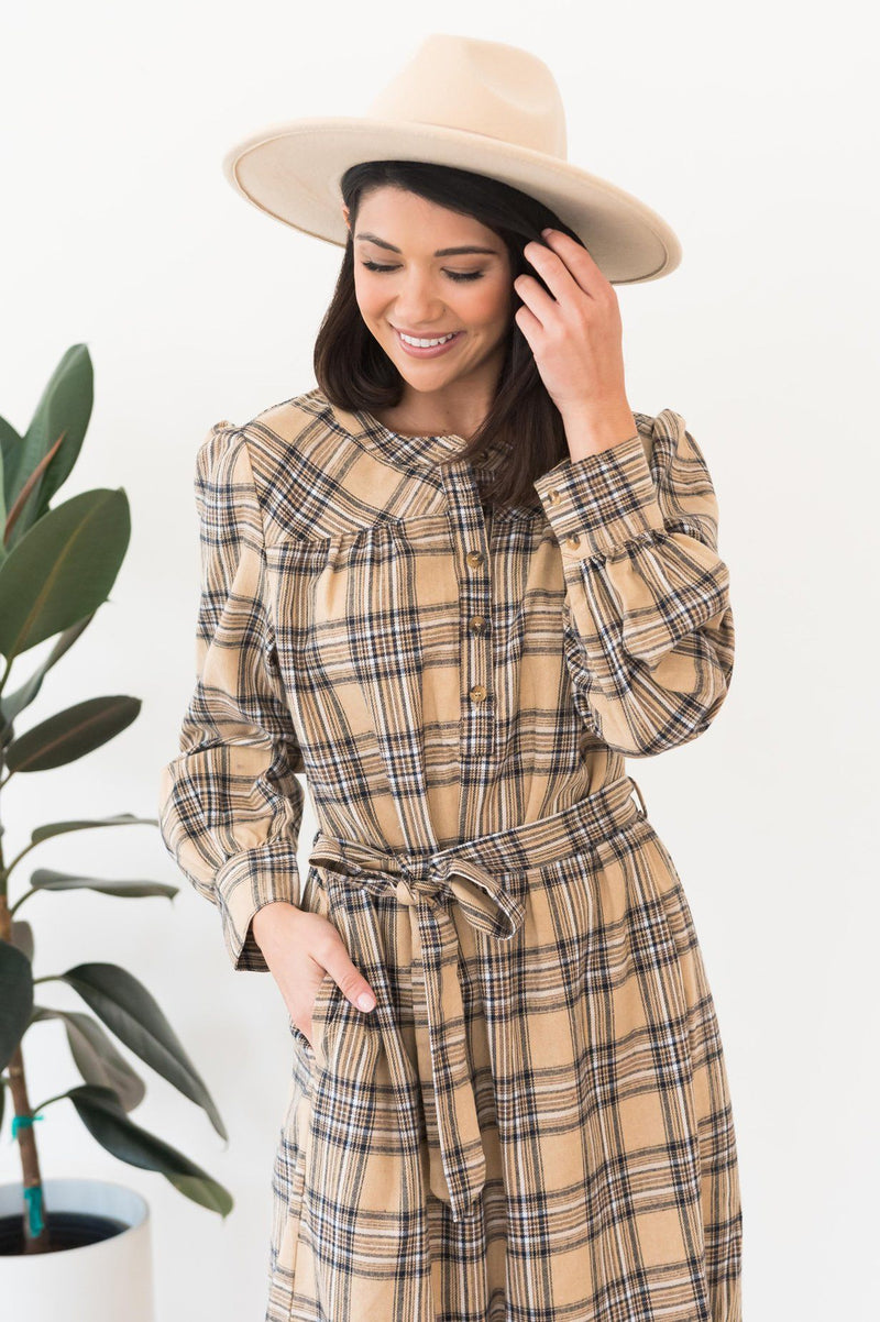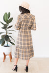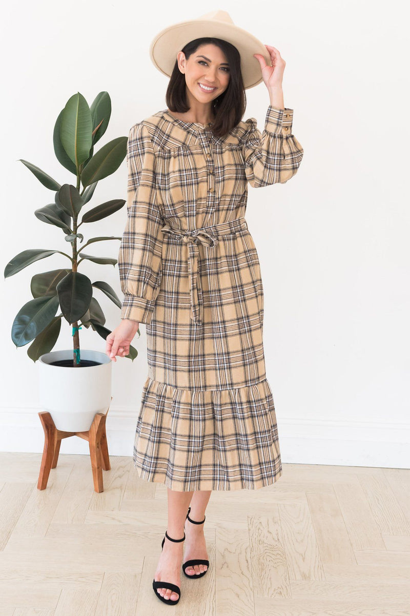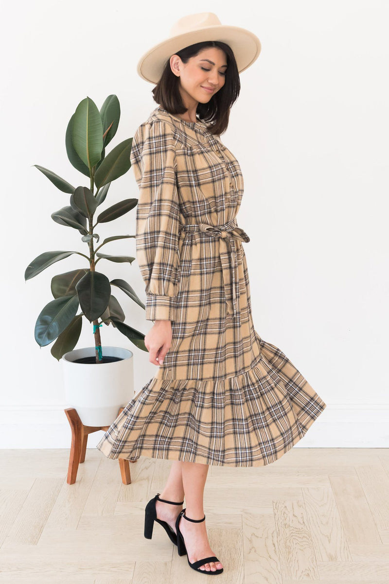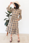 Say hello to this gorgeous new arrival! Featuring a rounded high neckline, a functional button up bodice that makes this beauty nursing friendly, a gorgeous sandy beige color with ivory and black plaid print throughout, long sleeves with a cuffed hem, a belt tied waist, and a ruffled hem skirt! This gorgeous dress won't last long, get yours soon!