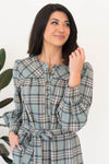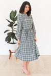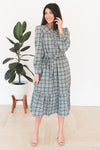 Say hello to this gorgeous new arrival! Featuring a rounded high neckline, a functional button up bodice that makes this beauty nursing friendly, a gorgeous dusty sage color with ivory, black, and tan plaid print throughout, long sleeves with a cuffed hem, a belt tied waist, and a ruffled hem skirt! This gorgeous dress won't last long, get yours soon!