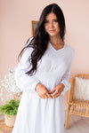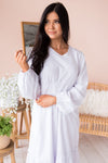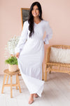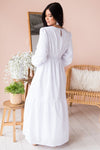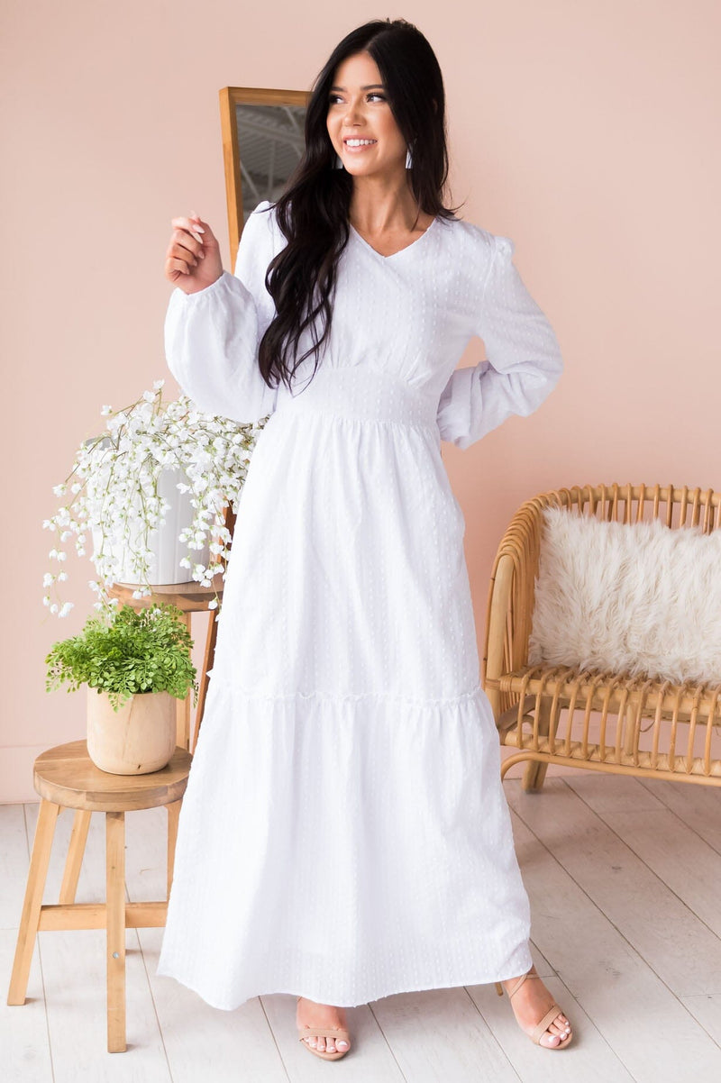 This delicate swiss dot beauty is a must have! Dress features include a banded sweetheart waistline, soft v-neckline, keyhole button closure and a darling tiered maxi skirt, & simple long sleeves. You are not going to want to miss out on our lovely Kinlee!