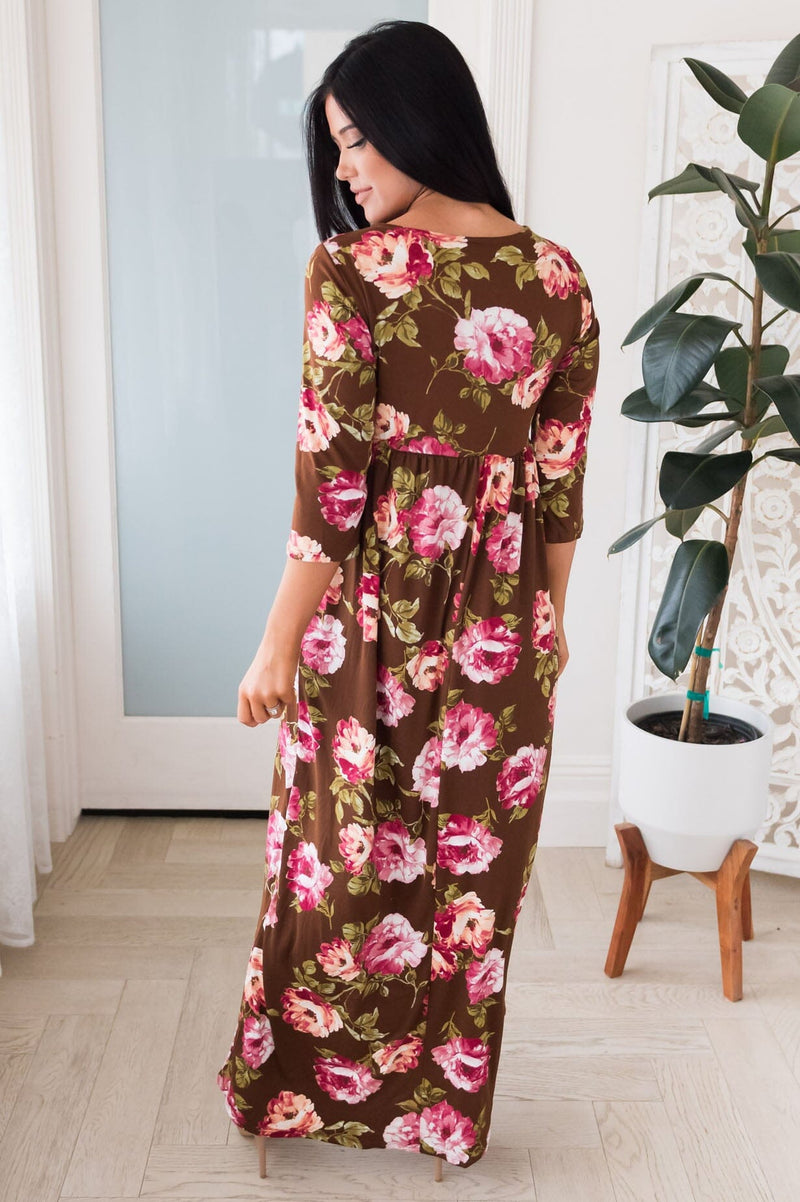 Trust us, when we say, add to cart now! The new modest maxi dress is going to go fast! Everyone loves our cozy soft, classy floral maxi dresses. Our Kinsley is available in three florals and features a round neckline, 3/4 length sleeves and pockets.