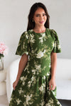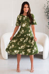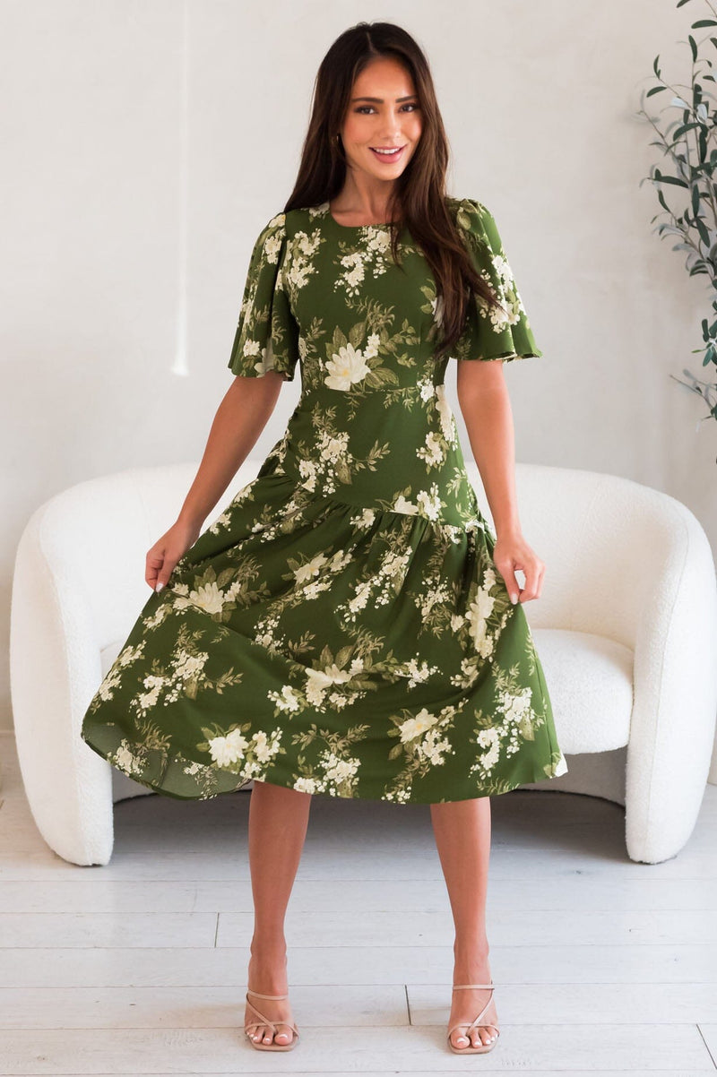 If you have been on search for the perfect floral dress for all your upcoming special occasions, look no further! Our new, modest, Kiri Dress, is the one for you. Featuring a round neckline, beautiful half length flutter sleeves, unique drop waistline and a flowy tea-length skirt.