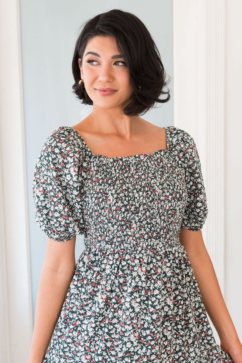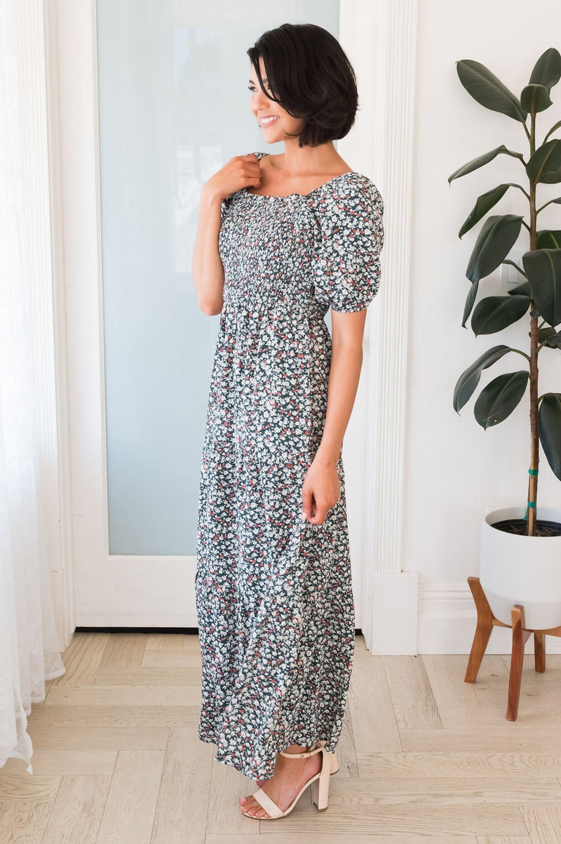 The darling floral Kit is twirl worthy and a must have for every wardrobe! Featuring a lovely flowy tiered maxi length skirt, short puff sleeves and flattering smocked bodice! You simply can not go wrong with this dress, add to cart now!