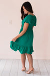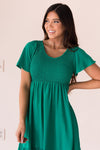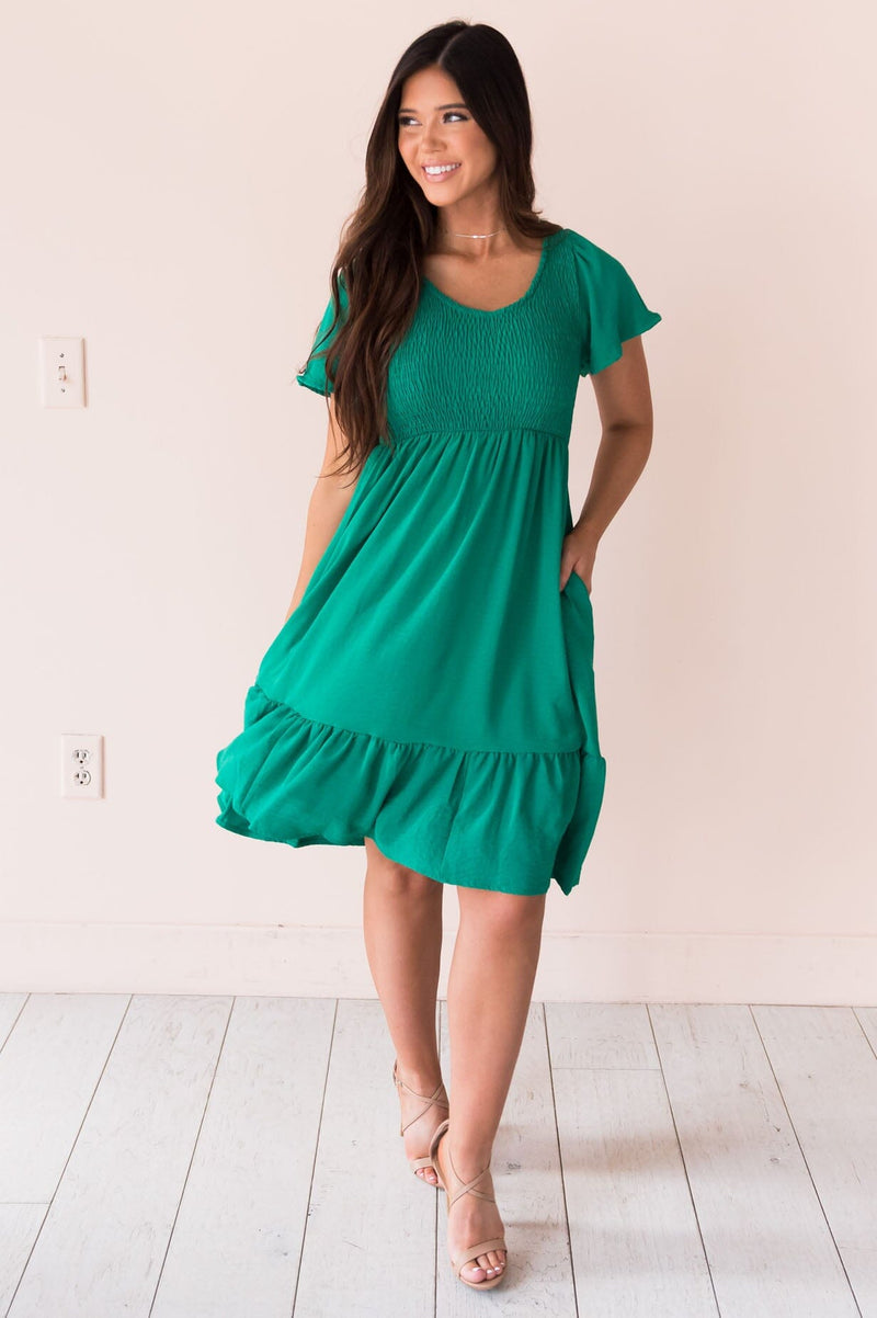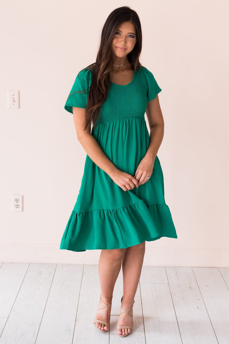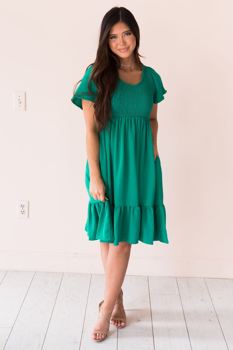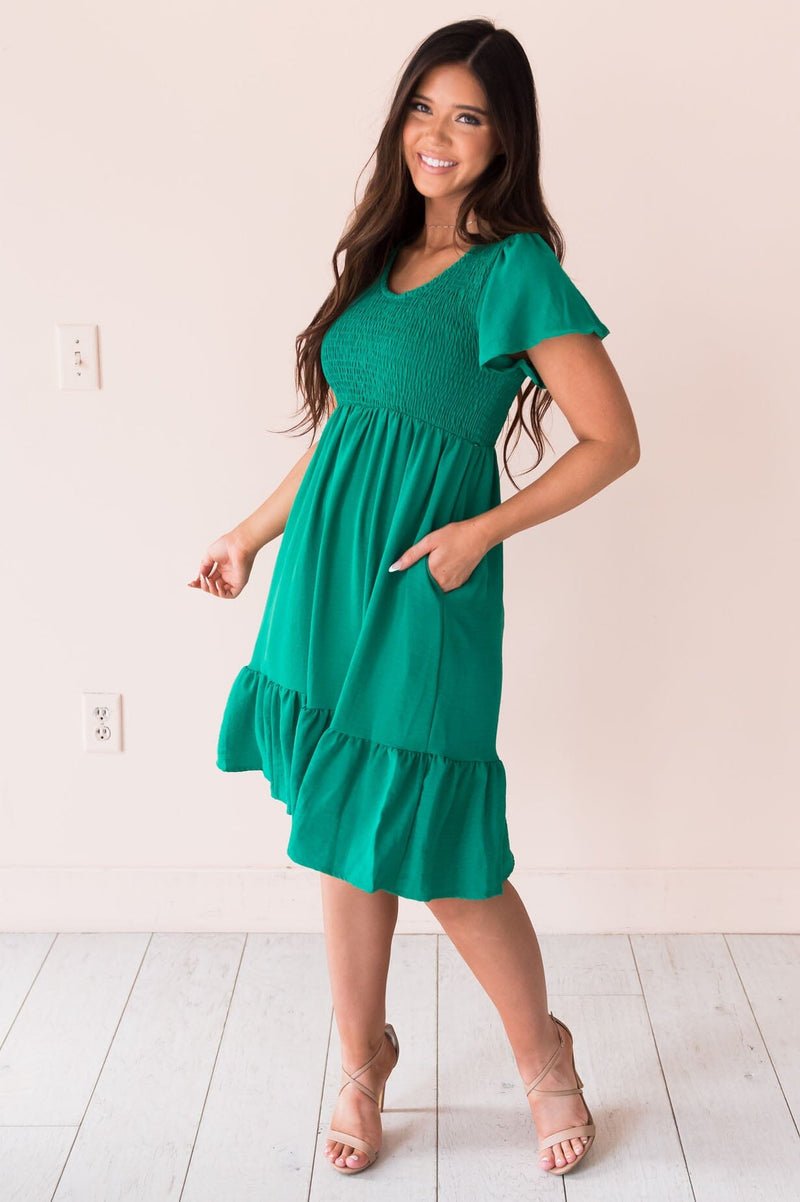 How fun and flattering is our new, modest, Kitt Dress! This cute dress is easy-to-wear and so comfortable. Featuring a scoop neckline, smocked bodice, short flutter sleeves, crepe fabrics, and a flattering ruffle hem skirt.