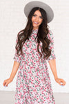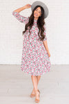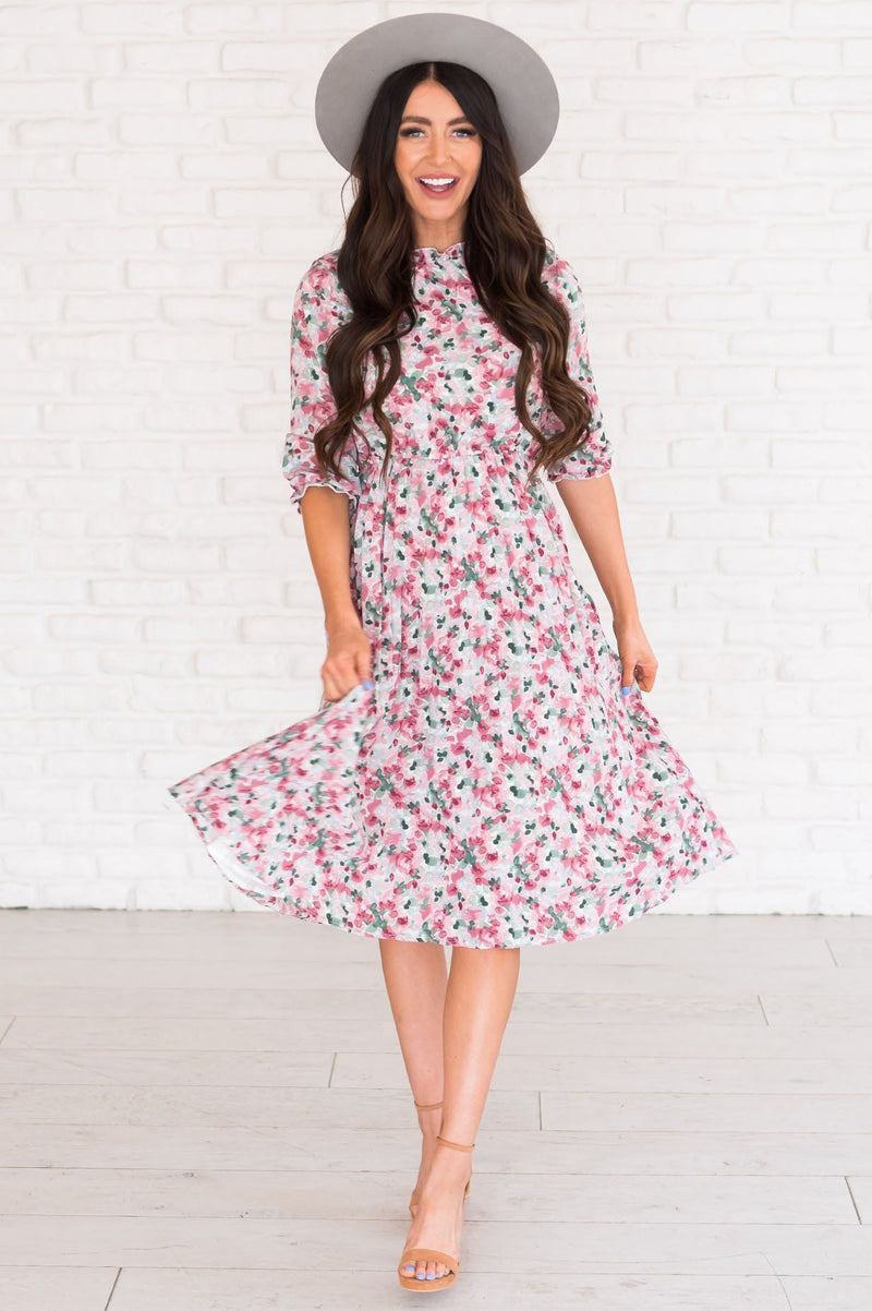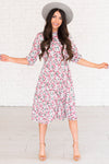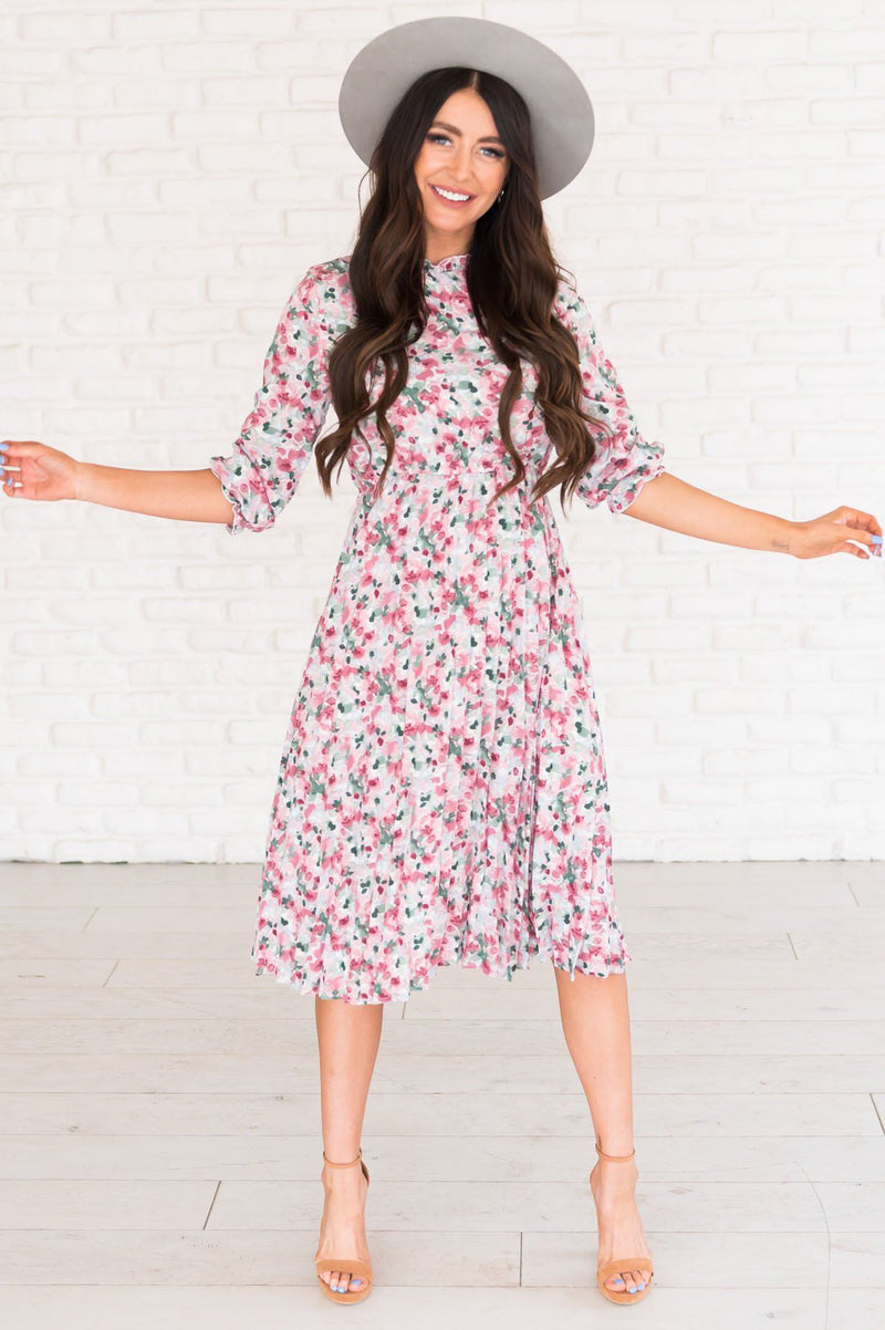 We are overjoyed to welcome the Knox this season and know you will be too! The fabulous pleated skirt, quarter length bell sleeves, and high neckline with ruffle detailing is just perfect for summer! We adore this blurred burgundy and forest green floral design!
