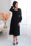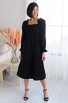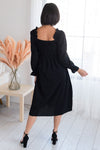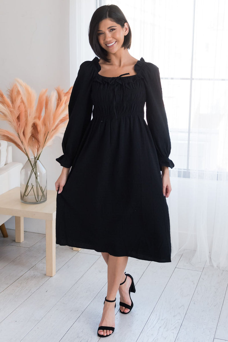 The Kolbi is such a gorgeous classy black dress, it's truly an add to cart now type of dress! Features include a modest smocked bodice, long sleeves and the perfect tea-length skirt. It's a true must have!