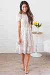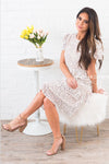 We are loving every beautiful detail about this new dress! The Korra dress features a modest round neckline with shirred bodice detailing, short double ruffle flutter sleeves, elastic waist and the most feminine double ruffle hemline. We also love the flowy feminine grey dot pattern print! Get yours today!