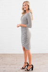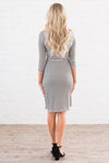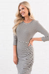 Wanting that perfect dress for all those outings you have coming up? Look no further the new Kortney is going to be your new go-to! This dress has all the perfect details that everyone will love. The skirt features a faux wrap detail as well as a side ruching, a round neckline, 3/4 length sleeves, elastic waistband and the most stretchy cozy striped jersey material.