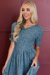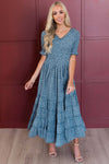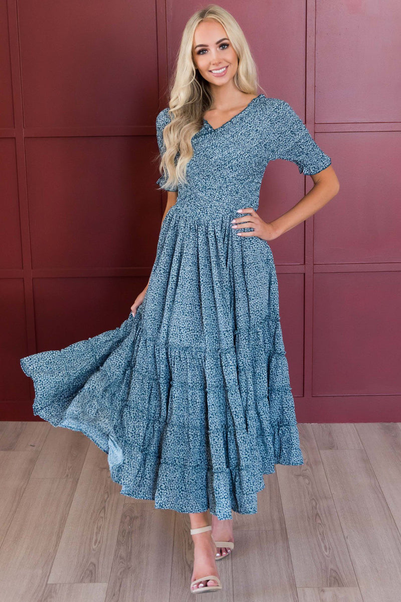 The perfect tiered dress is here just in time for fall! We simply can not get over the lovely teal and white floral print, short ruffle trim sleeves, darling crossover shirred bodice detailing and tiered flowy tea length skirt! You simply can not go wrong with this modest style!