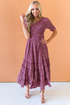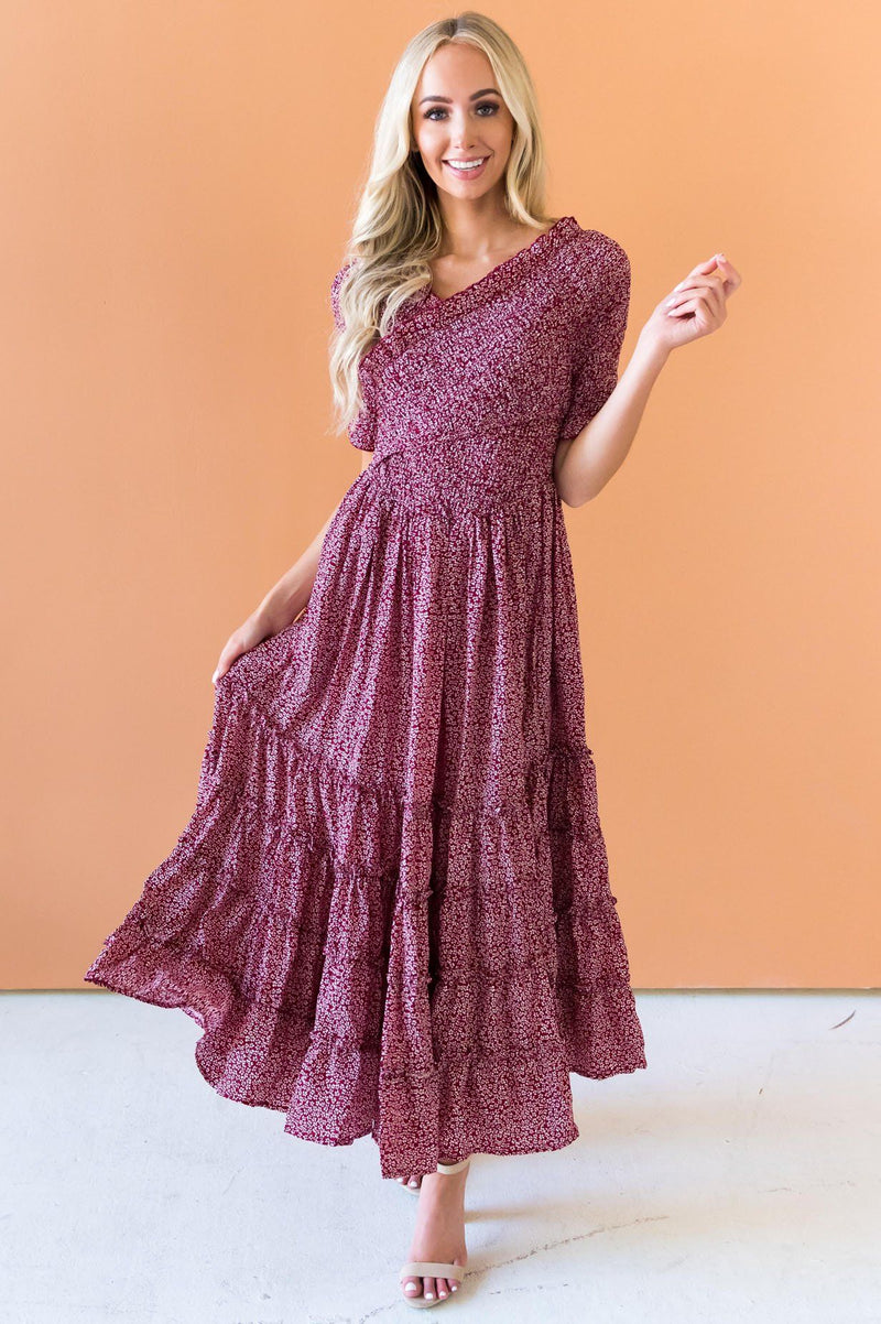 The perfect tiered dress is here just in time for fall! We simply can not get over the lovely burgundy and white floral print, short ruffle trim sleeves, darling crossover shirred bodice detailing and tiered flowy tea length skirt! You simply can not go wrong with this modest style!