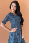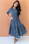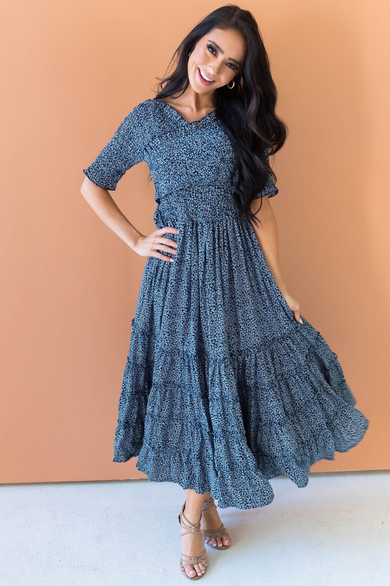 The perfect tiered dress is here just in time for fall! We simply can not get over the lovely navy and white floral print, short ruffle trim sleeves, darling crossover shirred bodice detailing and tiered flowy tea length skirt! You simply can not go wrong with this modest style!