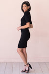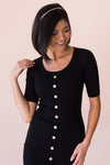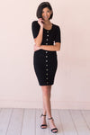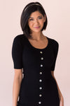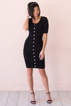 We always love pencil fit style dresses and the Kristy is simply stunning! Features include fitted ribbed material, half sleeves faux button front and the perfect length skirt. It's a true must have!