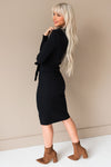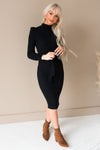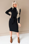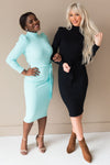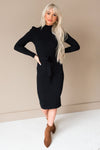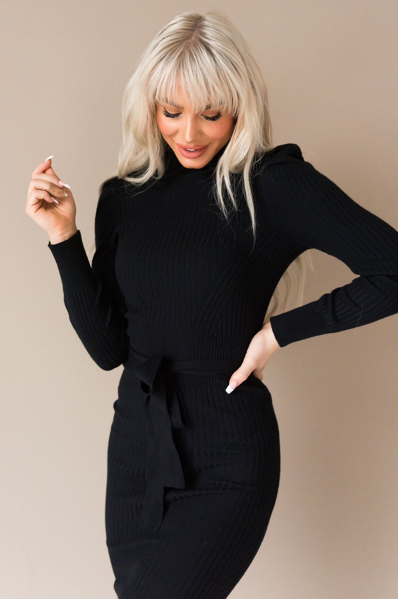 The Krystle is the absolute most darling sweater dress around! Featuring delicate ribbed sweater material, gorgeous trendy pleated ruffle shoulders, belt tie waist, long sleeves, ever so perfect tea length skirt and our favorite pencil style fit.