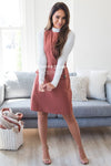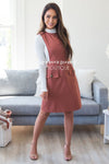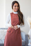 This lovely overall dress is perfect to wear all year long. We are loving the neutral earthy rust tone perfect for pairing with pretty much anything! Featuring a high rounded neckline with functional shoulder buttons, lined skirt with the cutest front buttoned pockets, a fitted waist and back zipper, you will be in love for sure. Get it today!