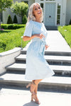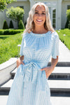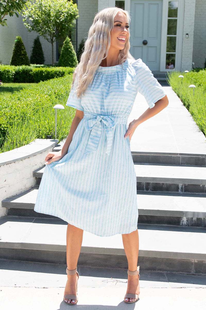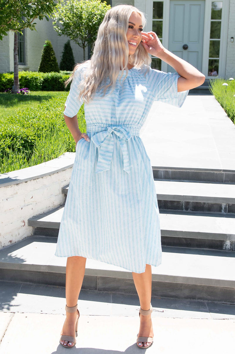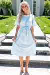 This new Kyleigh dress is the talk of the town! This dress features; Short sleeves, peek a boo modest cap shoulder, pockets, tie waist, flowy skirt, elastic round neckline. You will feel absolutely stunning in this stunner this summer! Get yours today before they are all gone.