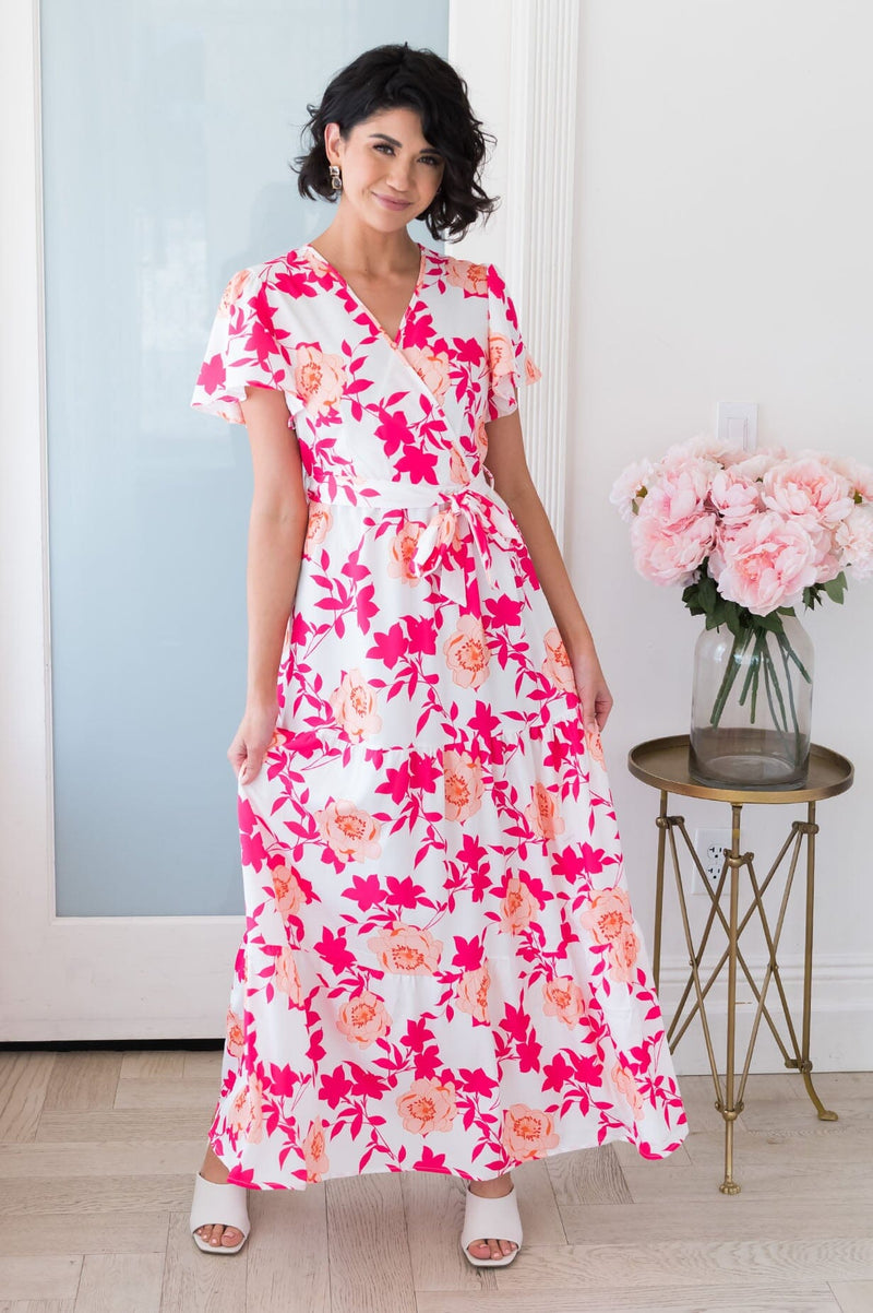 Say hello to the prettiest new summer dress! Our modest Lahela Dress features cross front bodice (ideal for nursing mothers), cute short flutter sleeves, a waist tie, and ruffle tiered maxi skirt. We found steaming works great after taking it out of the packaging to release any wrinkles.