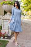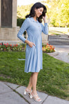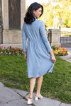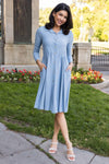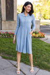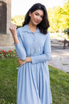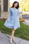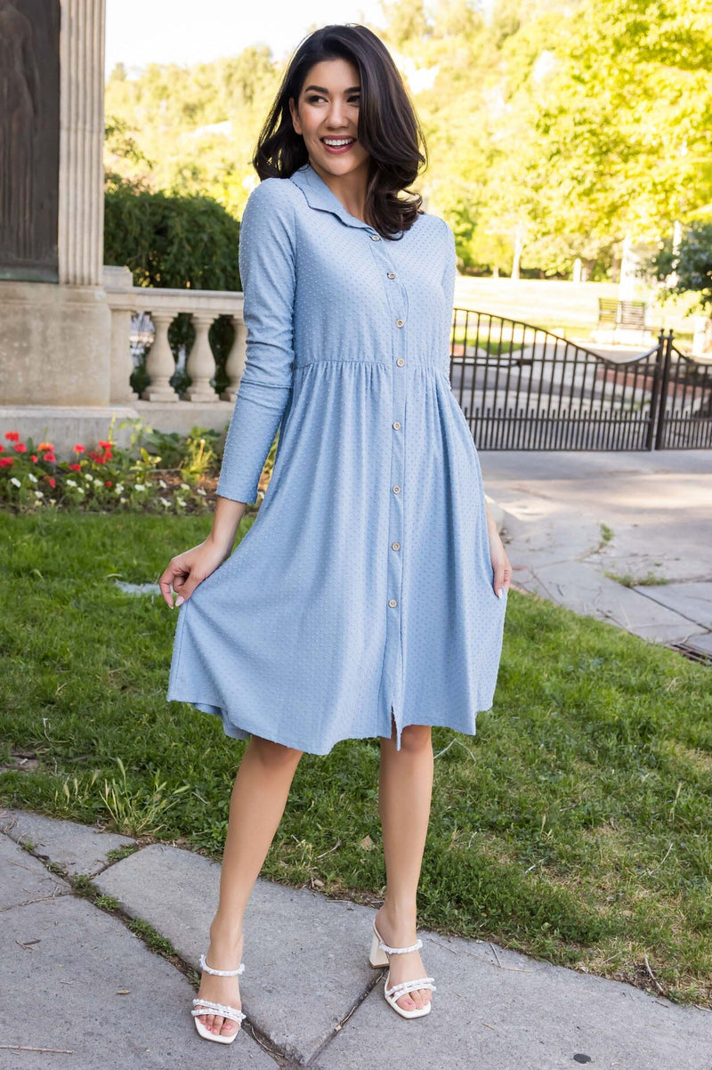 Business to casual, from business to fun! The darling new mini swiss dot Laine is perfect for your busy day of work or a fun day out with friends! Featuring a collared neckline, functional button front, long sleeves and gorgeous denim blue color! Get yours today!