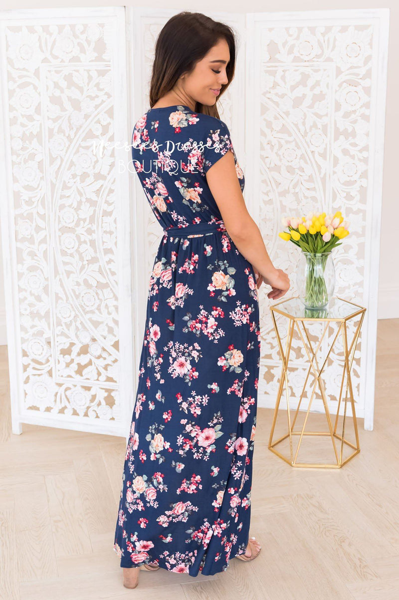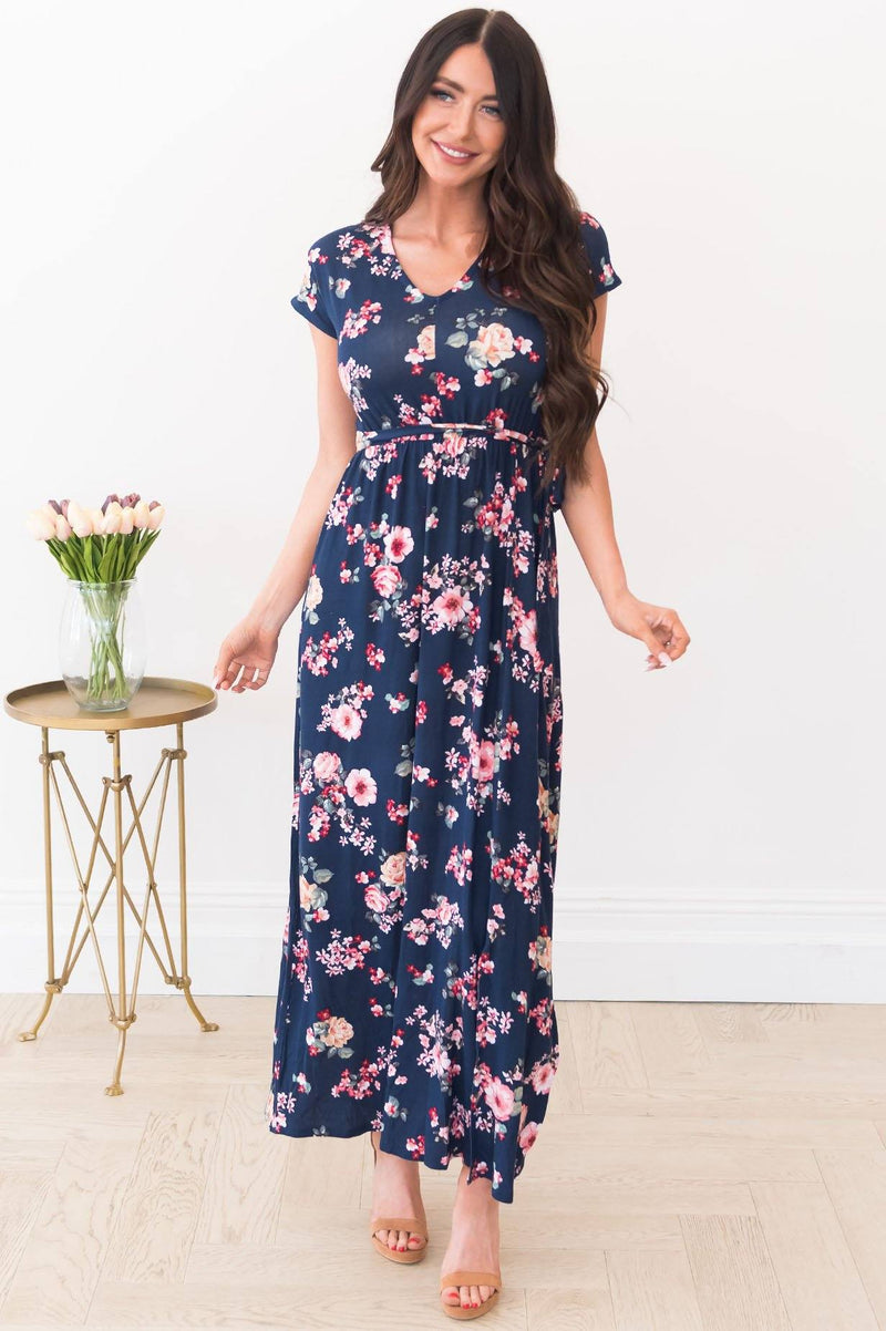 The Launa has all the most elegant features and we are so excited to share them with you all! Lovely soft v-neckline, dolman style short sleeves, elastic waist with belt tie, and last but definitely not least the full maxi skirt with modest side hemline slit. Get yours today!