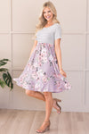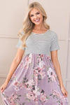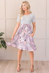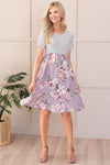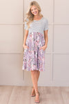 The Lawson is a combination of a classic horizontal thin striped bodice, functional pockets, and a soft lavender skirt with a elegant and feminine floral print to top it all off! The cap sleeves, cinched waistline and mid-length modest fit will have you hooked!