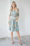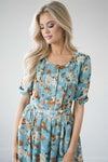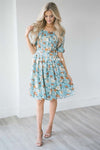 The Layla if full of gorgeous details that you are going to love! Dress features a rust, sage and light yellow floral print, vertical pleats on the bodice, flowy half sleeves, and a waist band followed by a gathered skirt. Bodice has functioning buttons, back waist is elastic and dress slips on. Lined. Belt is not included.
