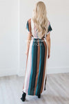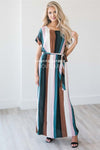 The Leanna has all the fall colors you are looking for! It is beyond beautiful! This dress features multi colored stripes, short sleeves, a rounded neck line, a gathered tie waist and side pockets!