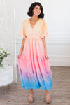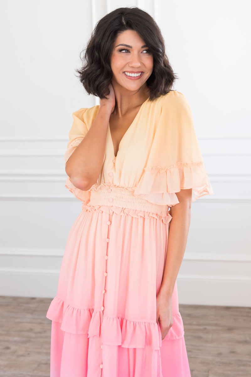 We are obsessed with this gorgeous modest colorful dress! With amazing features such as the stunning light yellow, peach, pink, lavender, and blue color combo, modest v-neckline, cinched ruffle waistline and short flutter sleeves, you simply can not go wrong! Get yours today!