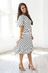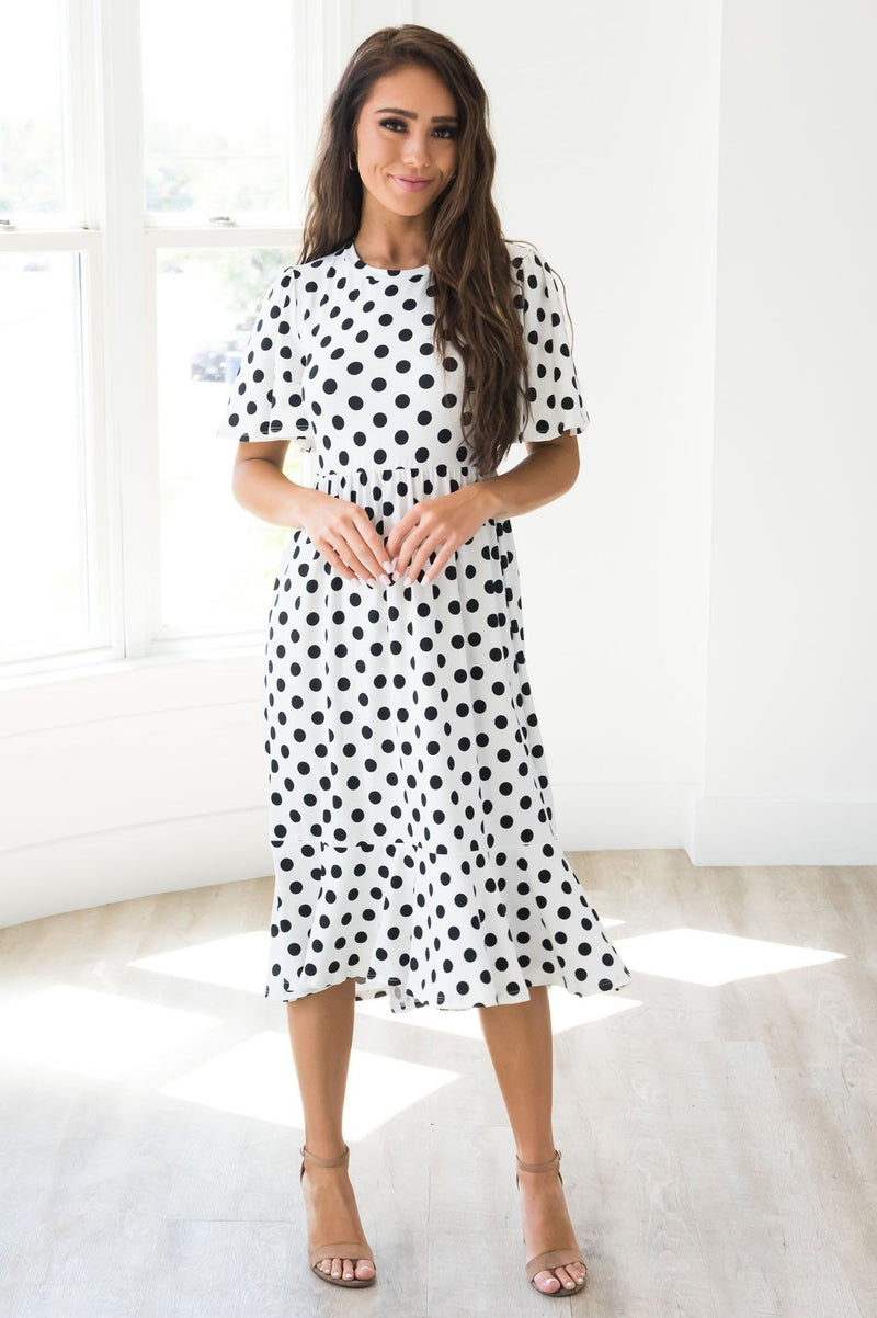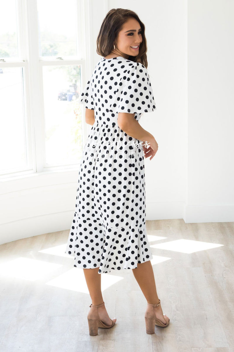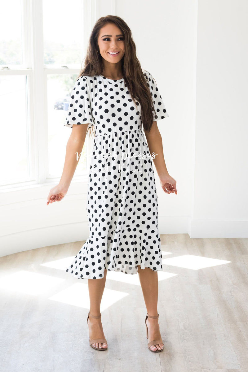 Comfort and Style in one darling dress! The Leila is the perfect dress for all your summertime events! This beautiful polka dot dress features a ruffle hem bottom, short flutter sleeves, and an elastic waist!