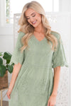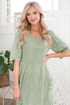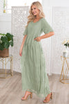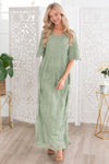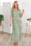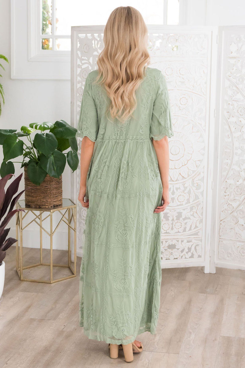 Create the perfect bohemian chic outfit with this stunning new maxi dress! You will fall in love with this gorgeous new lace, it adds the perfect feminine touch to this dress. pistachio maxi dress features a beautiful floral lace overlay, a v neck line, half scalloped sleeves and a full length maxi skirt. This dress is also fully lined.