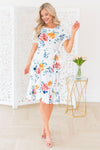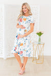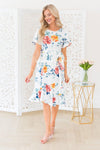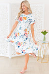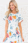 This darling modest dress is going to be your next go-to piece! The Lexy has some lovely modest features to include. A modest round neckline, short wrap flutter sleeves, elastic waist with belt tie and a flowy faux wrap ruffle skirt. Not to mention the lovely classy ivory floral print, this one is a must have!