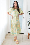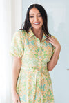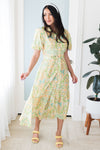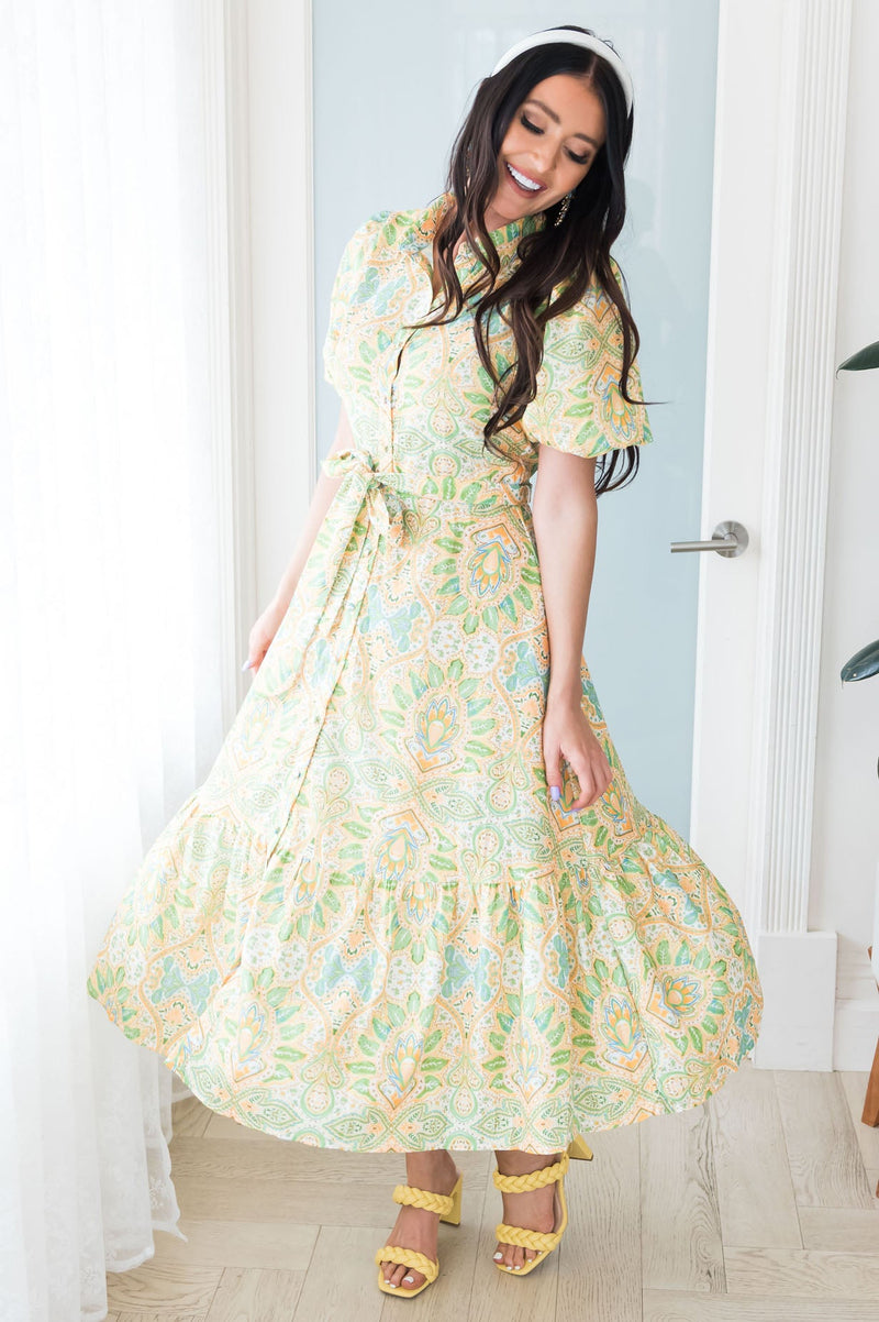 We are obsessed with this gorgeous modest paisley floral dress! With amazing features such as the stunning yellow and green color combination throughout, collared neckline with functional button front and feminine ruffled hem skirt! Get yours today!