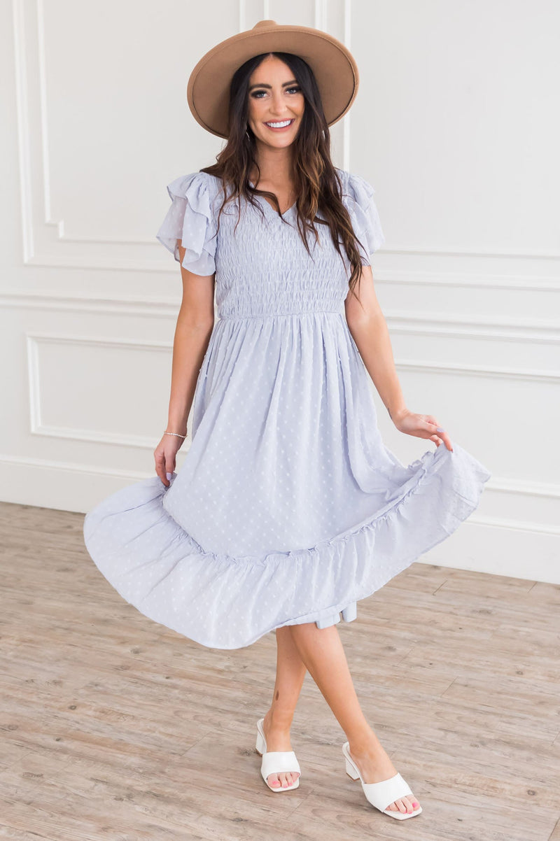 The Lina is the most feminine modest beauty we have ever laid eyes on! We are so in love with the short double ruffle flutter sleeves, delicate swiss dot material, flattering smocked bodice and ruffle hem skirt. Get yours today!