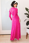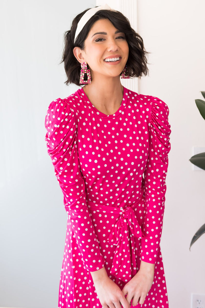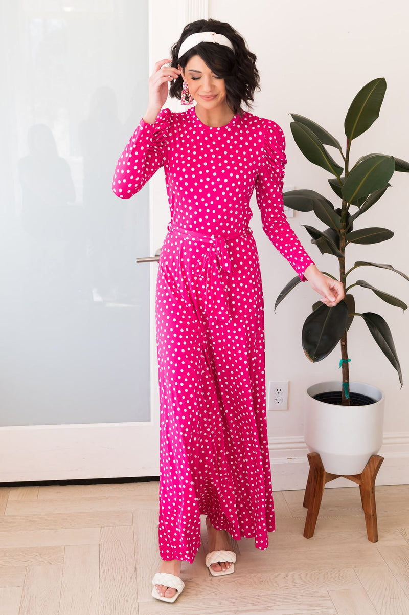 The Linna arrived and we have not been able to take our eyes off of it since! This lovely fuchsia polka dot beauty is a heart stealer! Features include on trend long puff sleeves, belt tie waist and the perfect length maxi!