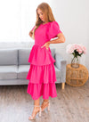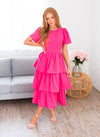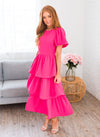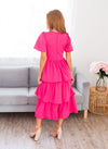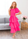 You will light up the room the second you walk in with the new, modest, Livy dress! This darling, feminine, beauty is bound to catch everyone's eye. Features include, a round neckline, short sleeves and a fun tiered skirt. Center back zipper.