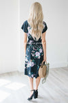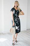 The Lizzy is oh so comfy and cute! This black dress features a bright floral print, a faux button front , a v neck line, an elastic waist and short dolman sleeves!