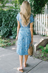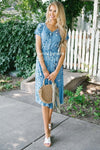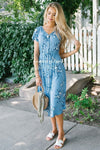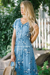 The Lizzy is oh so comfy and cute! This cornflower dress features royal blue floral print, a faux button front , a v neck line, an elastic waist and short dolman sleeves!