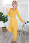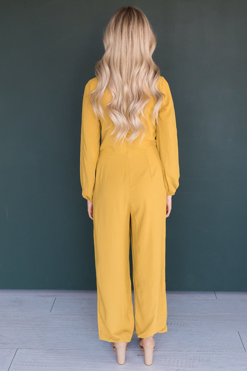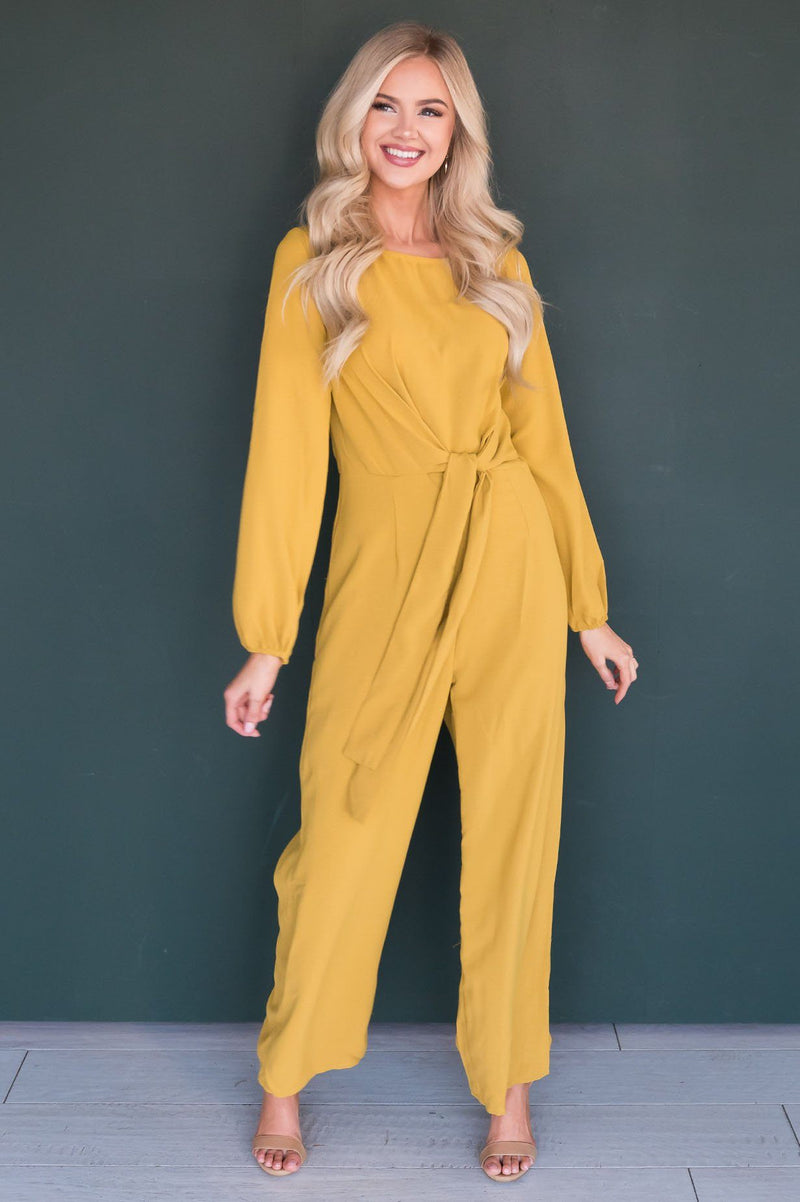 The Lolo is so chic and so sophisticated, make a statement with this full length piece! This jumpsuit will leave you turning heads at all your events! Mustard jumpsuit features a flattering twist front detail, long sleeves, round neckline, wide leg pants, and a back zipper closure.