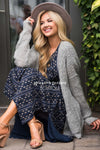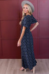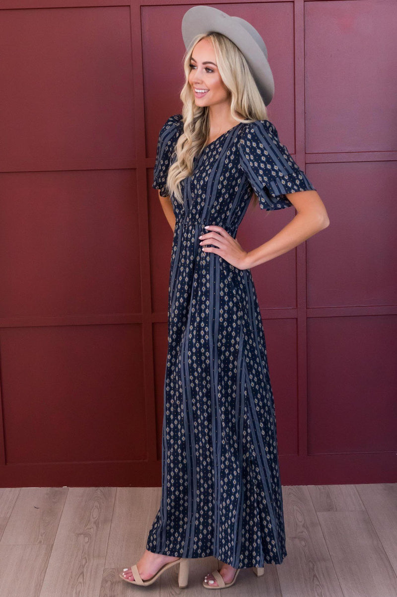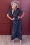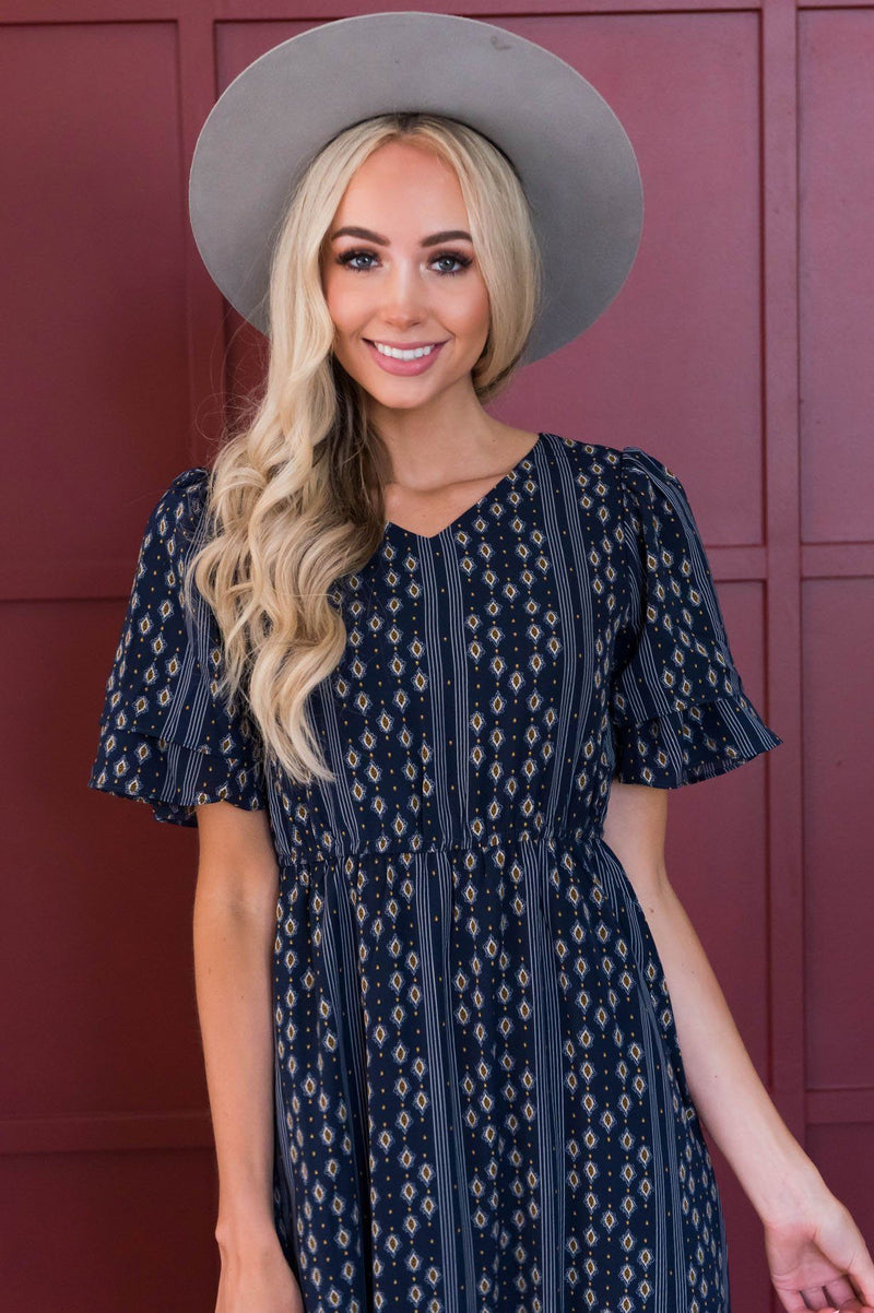 You are going to be so in love with our gorgeous New maxi! Featuring a lovely perfect for fall mustard and cream diamond pattern over a navy colored backdrop. It is so simple yet so eye catching. This maxi is lightweight and super comfortable. Trust us, it's going to be your new Fall go-to. This dress features a soft v neckline, gorgeous tiered ruffle sleeves, elastic waistband, leg slits and it comes lined everywhere except the arms. Get it today, you need The London hanging in your closet!