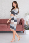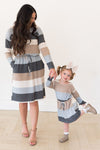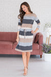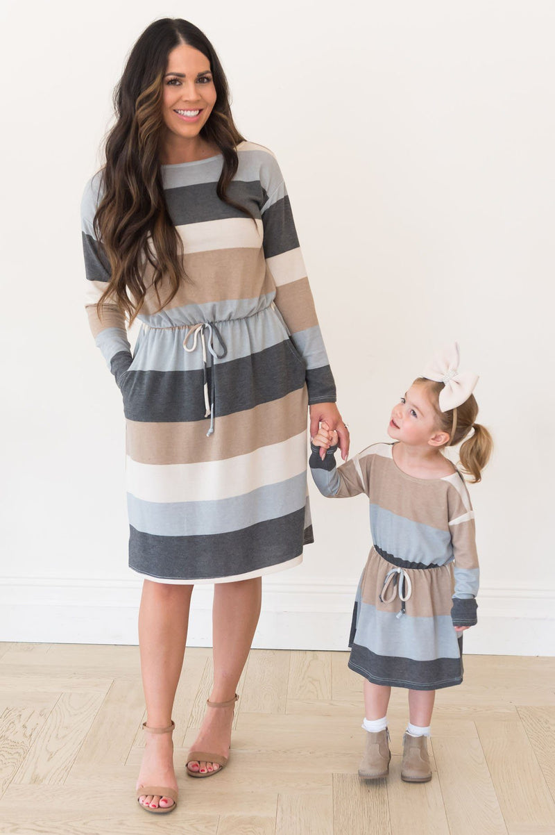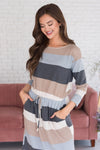 This long sleeve Kia is as cute as they come! There is nothing not to love about this casual comfy beauty! Featuring long sleeves, an elastic string tied waistline, pockets, and beautiful large grey, sky blue, ivory, and tan stripes throughout! We are absolutely in love with this new arrival!