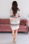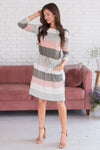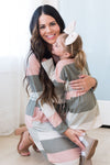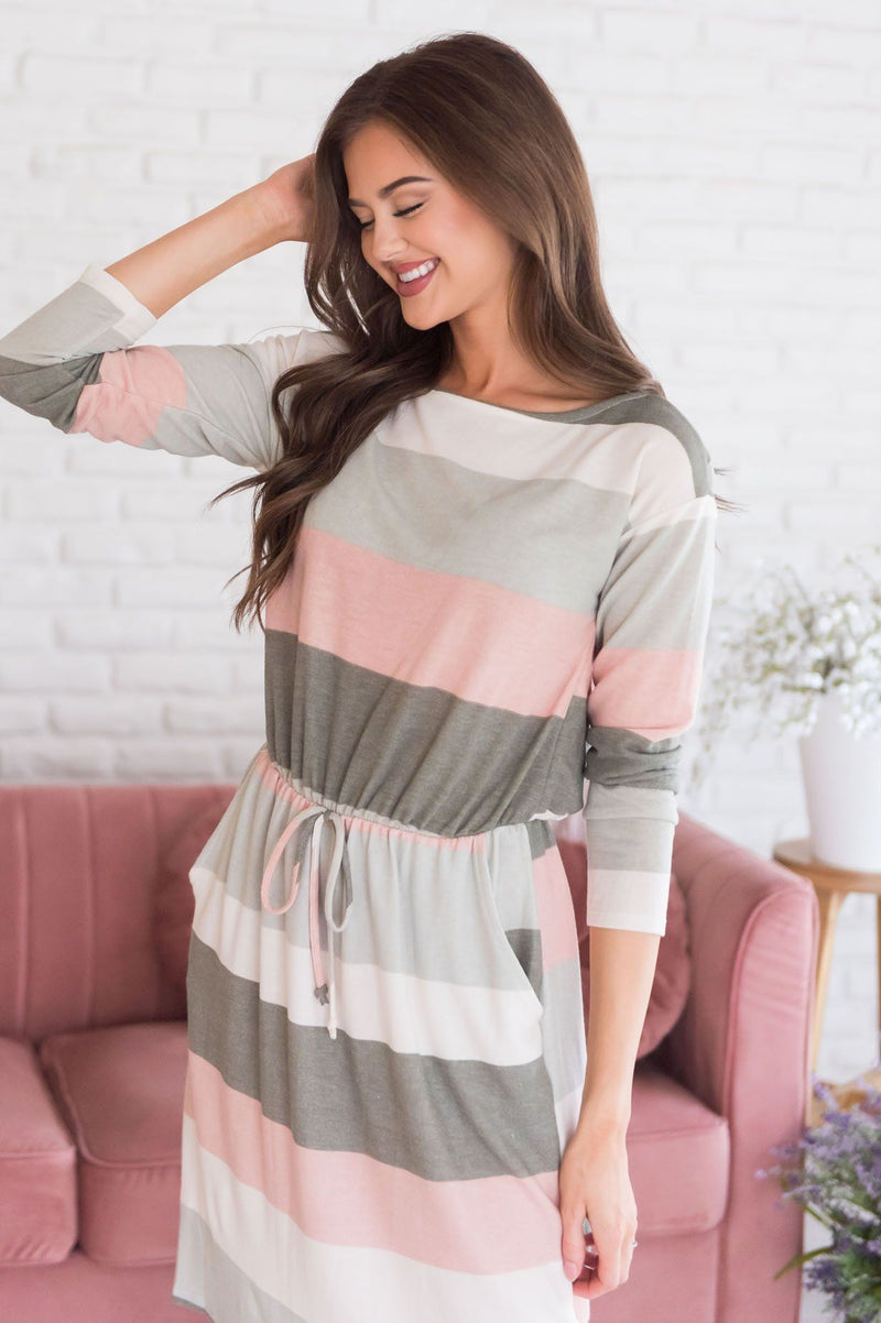 This long sleeve Kia is as cute as they come! There is nothing not to love about this casual comfy beauty! Featuring long sleeves, an elastic string tied waistline, pockets, and beautiful large peach, sage, ivory, and green stripes throughout! We are absolutely in love with this new arrival!