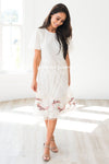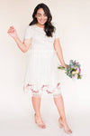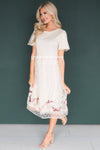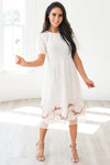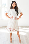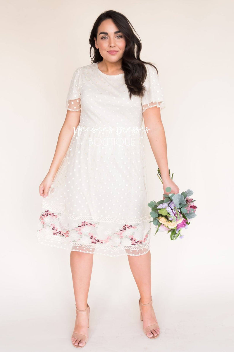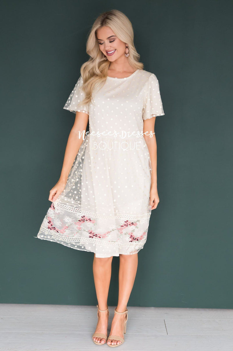 The lovely Luana will have you feeling feminine and gorgeous! The embroidery detailing on this dress is so delicate and classy! The mauve and burgundy flowers and soft yellow polka dots pair perfectly with the nude lining, giving you that perfect pop of color! You are going to love the gorgeous fit of this dress, the modest length and short sleeves.