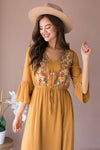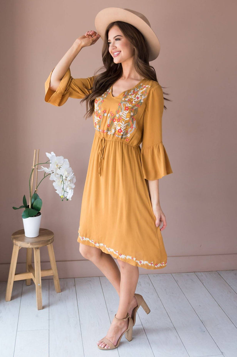 Say hello to this fall beauty! This beautiful golden brown dress has the most amazing features, such as long sleeves with a ruffled hem, string tied waist, v-neckline, and colorful floral embroidery on the front of the bodice and hem! We can't get enough of this new arrival, get yours before they're gone!