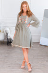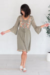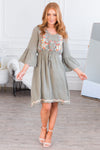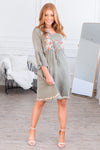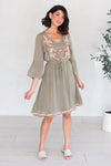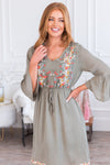 Say hello to this fall beauty! This beautiful sage green dress has the most amazing features, such as long sleeves with a ruffled hem, string tied waist, v-neckline, and colorful floral embroidery on the front of the bodice and hem! We can't get enough of this new arrival, get yours before they're gone!