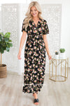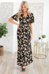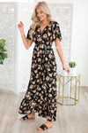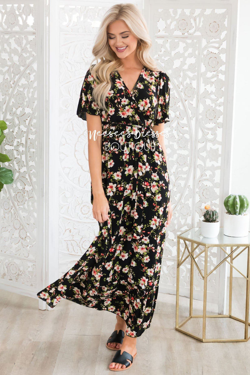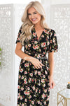 This lovely dress will be your new favorite! Comfortable, beautiful and perfect for nursing mothers too! Black dress features coral, yellow and burgundy floral print, a cross over front, short flutter sleeves and waist tie sash. This dress is unlined.