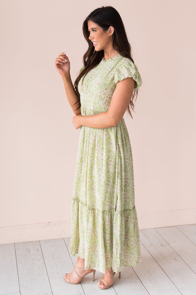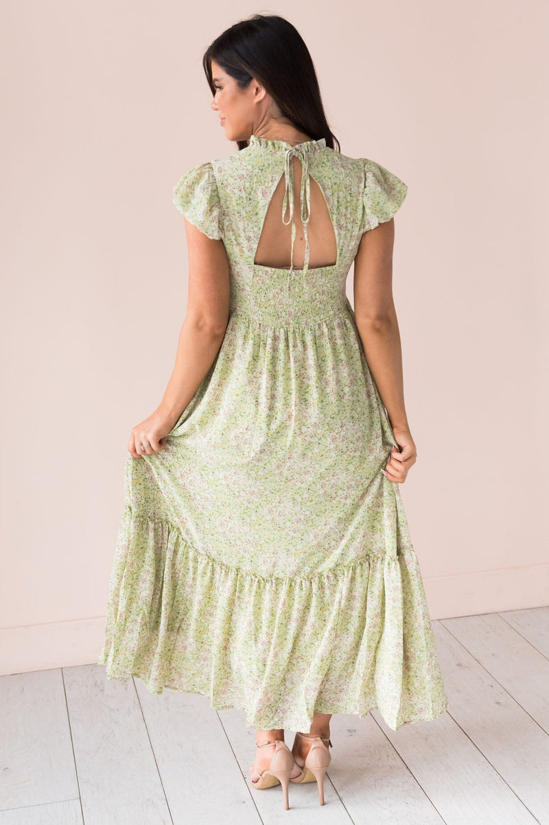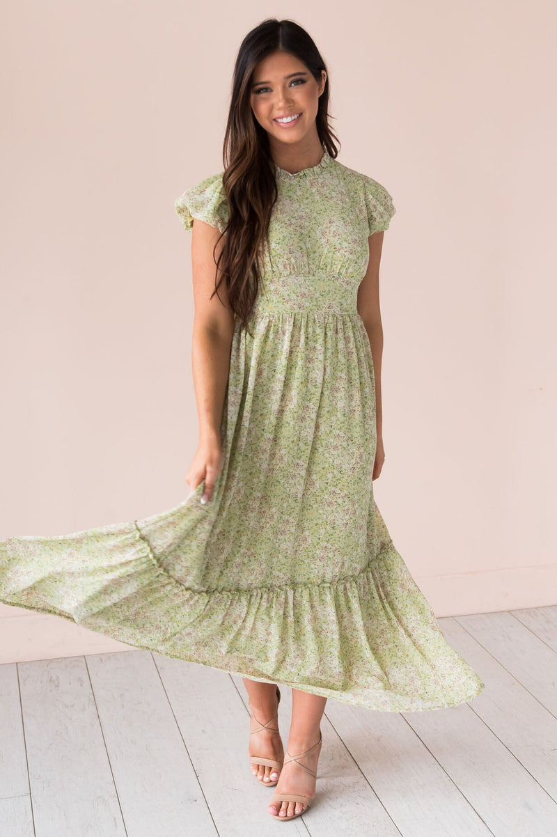 We have found the most beauty twirly addition for your wardrobe! The Lumina has stolen our hearts and will illuminate your wardrobe! Features include, a lovely sage, mauve & ivory floral print, short puff sleeves, darling wide pleated waistline, unique back tie closure and our ever so favorite ruffle hem skirt! Get yours today!