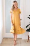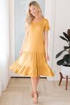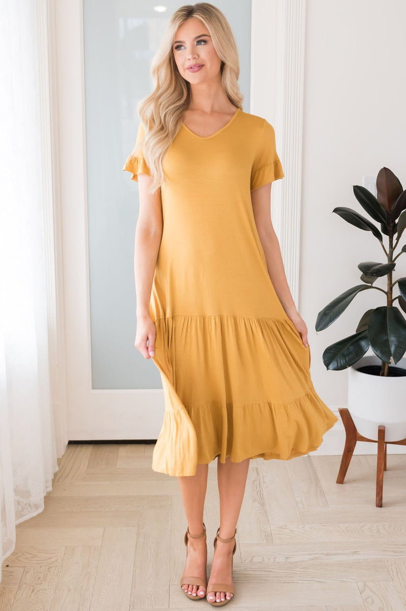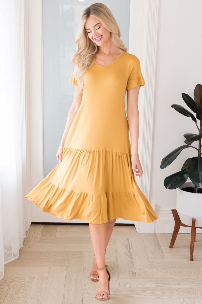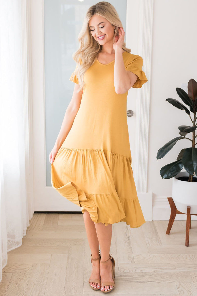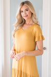 The Lynell is here and ready for any event you have coming up! The tiered ruffle skirt and lightweight material really allows for the perfect summer dress! This golden yellow will have you in awe! We just adore the v neck style and ruffle sleeves too!