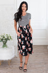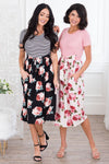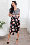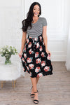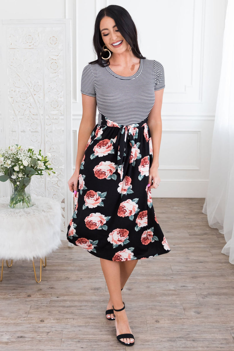 Been on the search for the perfect dress? This floral beauty is it, get your Macee before they are all gone! Featuring a cozy soft material, comfy fitted striped bodice with short sleeves, belt tie waist and a gorgeous flowy skirt!