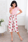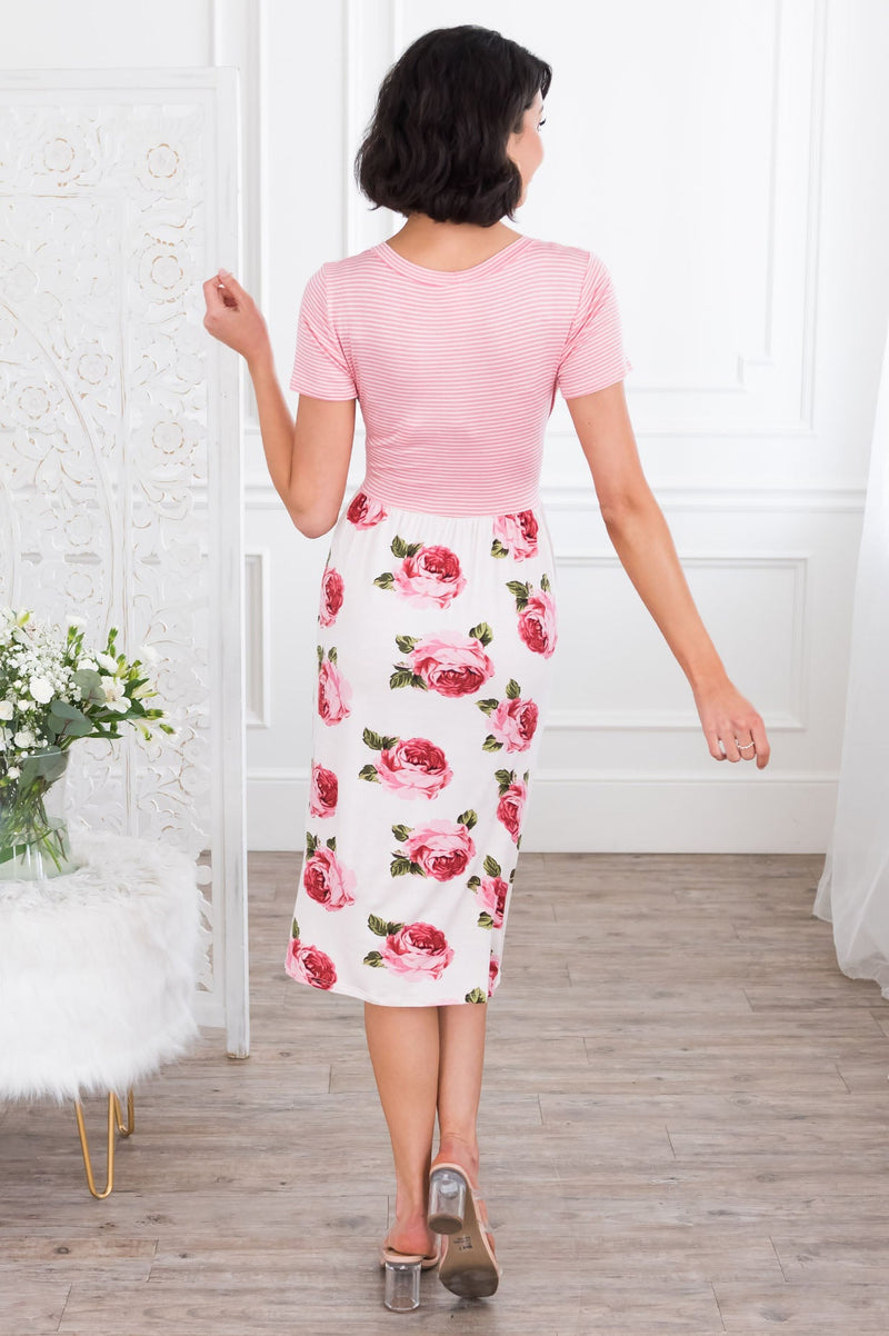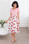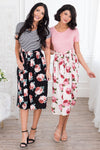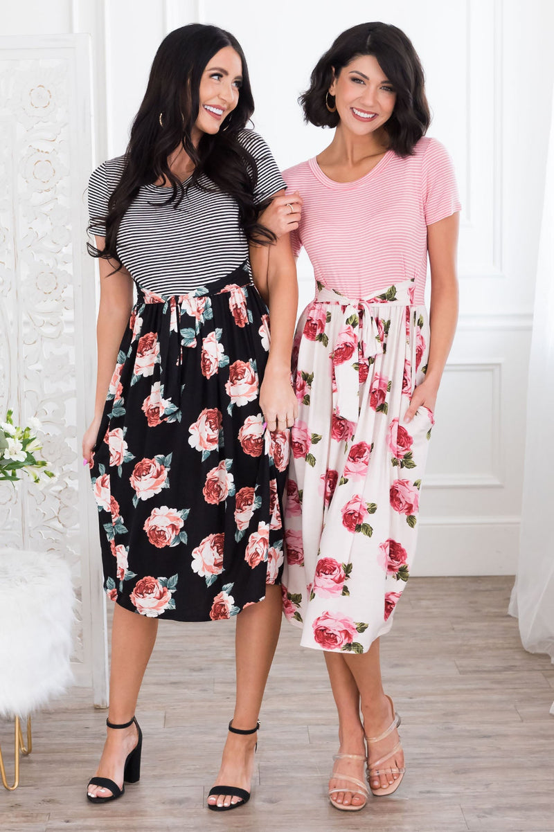 Been on the search for the perfect dress? This floral beauty is it, get your Macee before they are all gone! Featuring a cozy soft material, comfy fitted striped bodice with short sleeves, belt tie waist and a gorgeous flowy skirt!