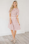 The Macey is the perfect spring picnic dress! It is comfy and oh so cute! This dusty pink and white plaid dress features a high neck line, half sleeves, a gathered waist and side seam pockets!