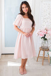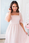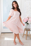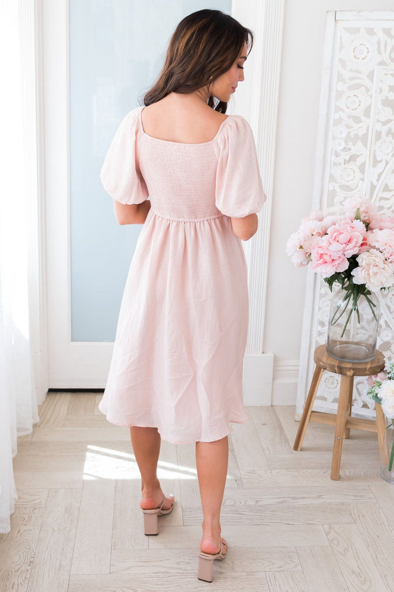 We are in love with stunning new Maclyn dress! This gorgeous, modest, shimmery beauty, is a true must have! Can you say *perfect* bridesmaids dress?! Featuring a squared neckline, perfect fit bodice, short puff sleeves, the absolute perfect blush color & flowy mid-length skirt. Get yours today!